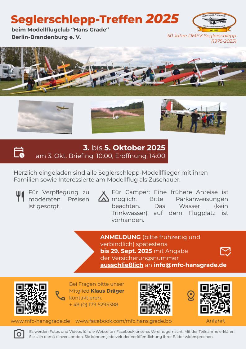 Vom 3. bis 5. Oktober 2025 lädt der Modellflugclub „Hans Grade“ Berlin-Brandenburg e. V. wieder zu seinem traditionellen Seglerschlepp-Treffen ein. Willkommen sind alle Seglerschlepp-Piloten mit ihren Familien sowie interessierte Zuschauer.
